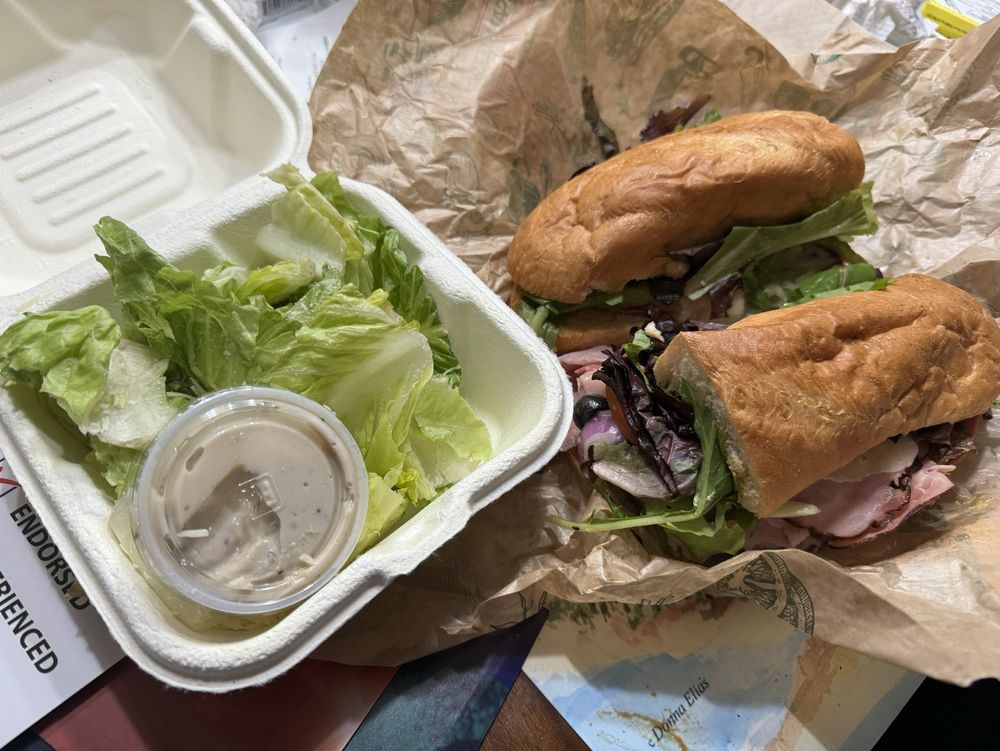 Smoked turkey, Black Forest ham and Black Angus roast beef, provolone, spring mix, tomato, mayo and spicy brown mustard on baguette. Includes a side and pickle spear.