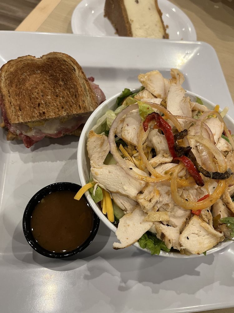 Crisp cucumbers, tomatoes, cheese and croutons over fresh greens with your choice of dressing and protein: All-Natural Chicken Strips, Ham, or Turkey. Comes with your choice of a side and a Mini Chocolate Chip Cookie.